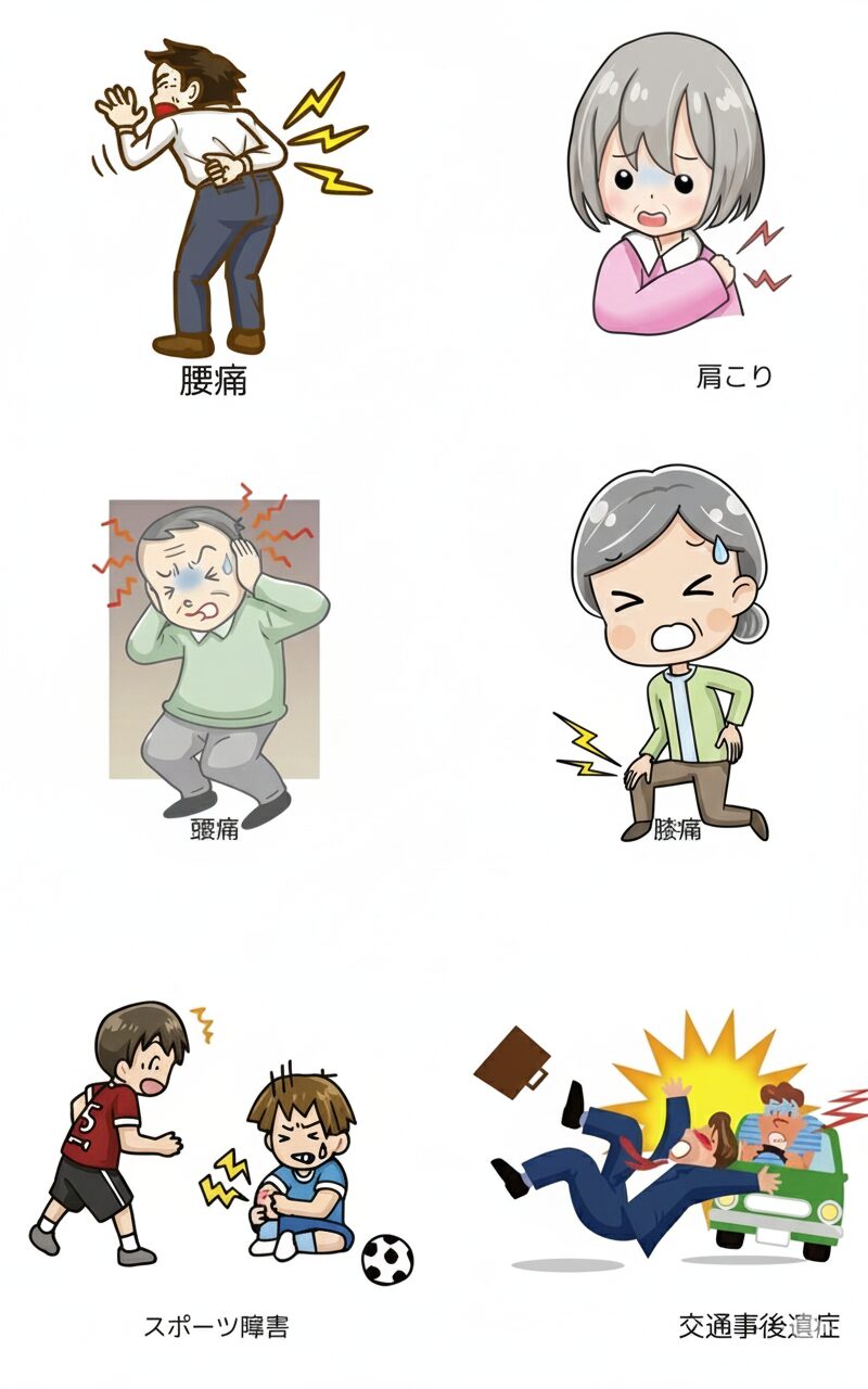 腰痛・肩こり・膝痛・頭痛・スポーツ障害・交通事故におけるお怪我、骨盤の歪みなど、様々な不調の原因に対処いたします。体調面で気になる事があれば、一人で悩やまずに、一度お気軽にご相談ください。